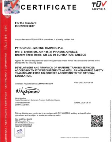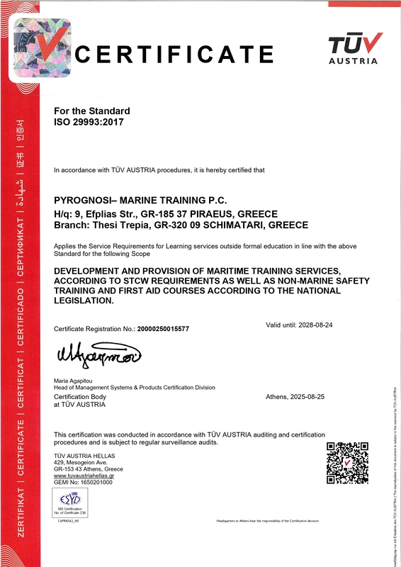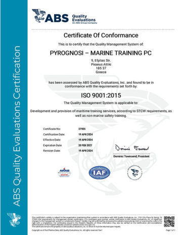 Our training center has been assessed and found to be in conformance with the requirements set forth by ABS Quality Evaluations, Inc.: ISO 9001:2015 and by TUV Austria: ISO 29993:2017 . The Quality Management Systems are applicable to: Development and Provision of Maritime Training Services, According to STCW Requirements, as well as Non-Marine Safety Training and First Aid Courses according to the national legislation.
