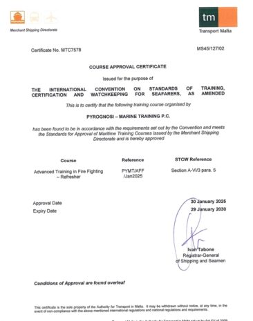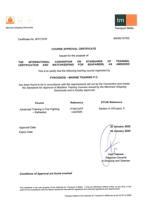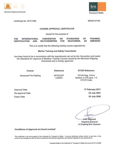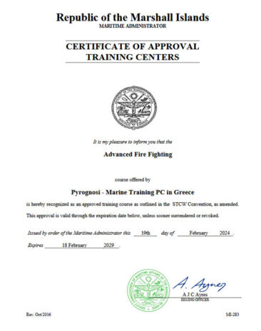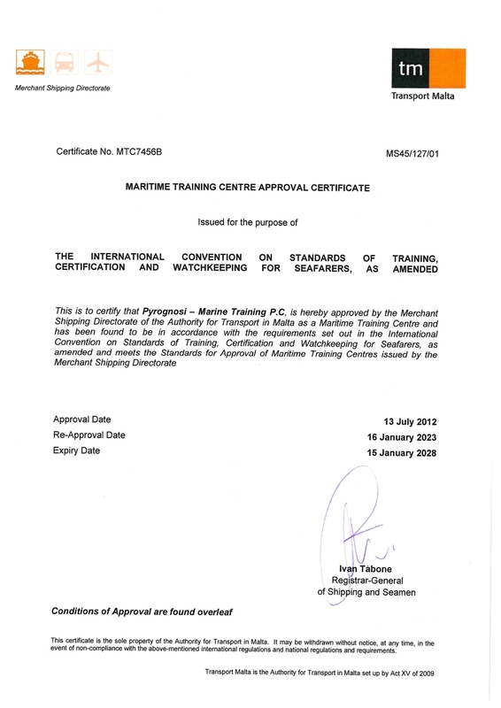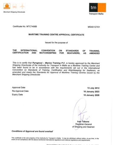 We are approved as an authorized training center to conduct maritime training courses on behalf of the Malta and the Republic of the Marshall Islands Flags under the STCW 1978 Convention as amended, defining the requirements and procedures by which regulatory training and certification for seagoing mariners should be provided by Flag Administrations and their authorized training centers.